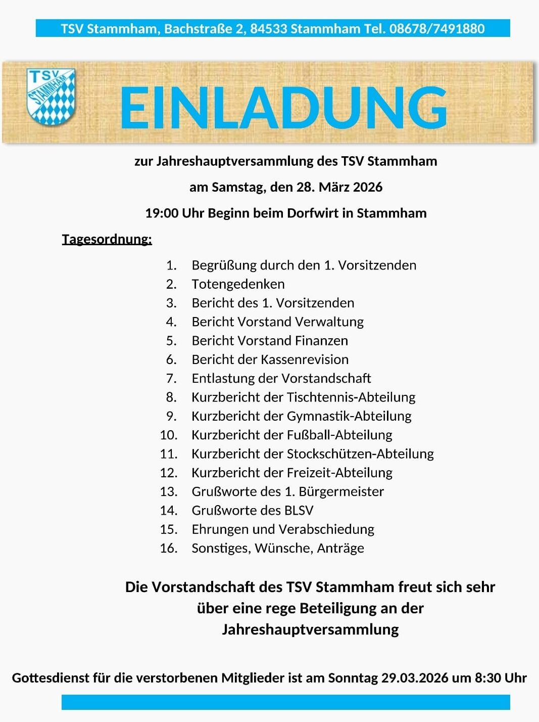 Der TSV lädt zur Jahreshauptversammlung am 28.03.2026 um 19:00 Uhr beim Dorfwirt ein.